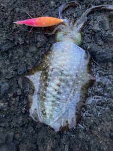 フォール中、グイッとエギを持っていかれたのに思わず合わせますがヒットせず。