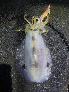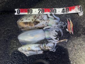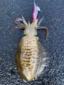すぐさまキャストしエギを沈めながら釣ったイカを処理。