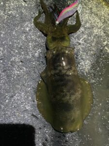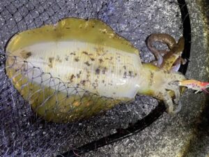 エギが浮いてこない様、ボトムまで沈め軽めにしゃくっていると開始一投目からガン!!とアタリ。