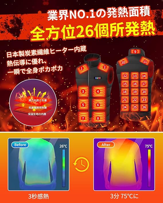 【全方位26箇所発熱&DC7.4V高出力&40000mAh大容量】